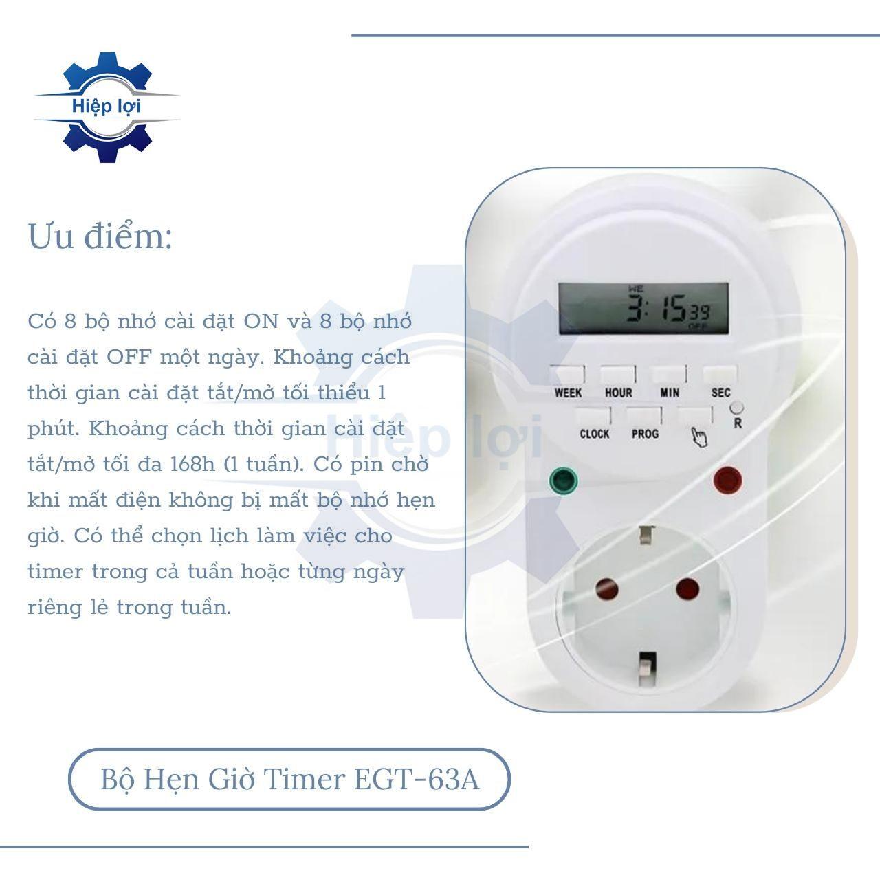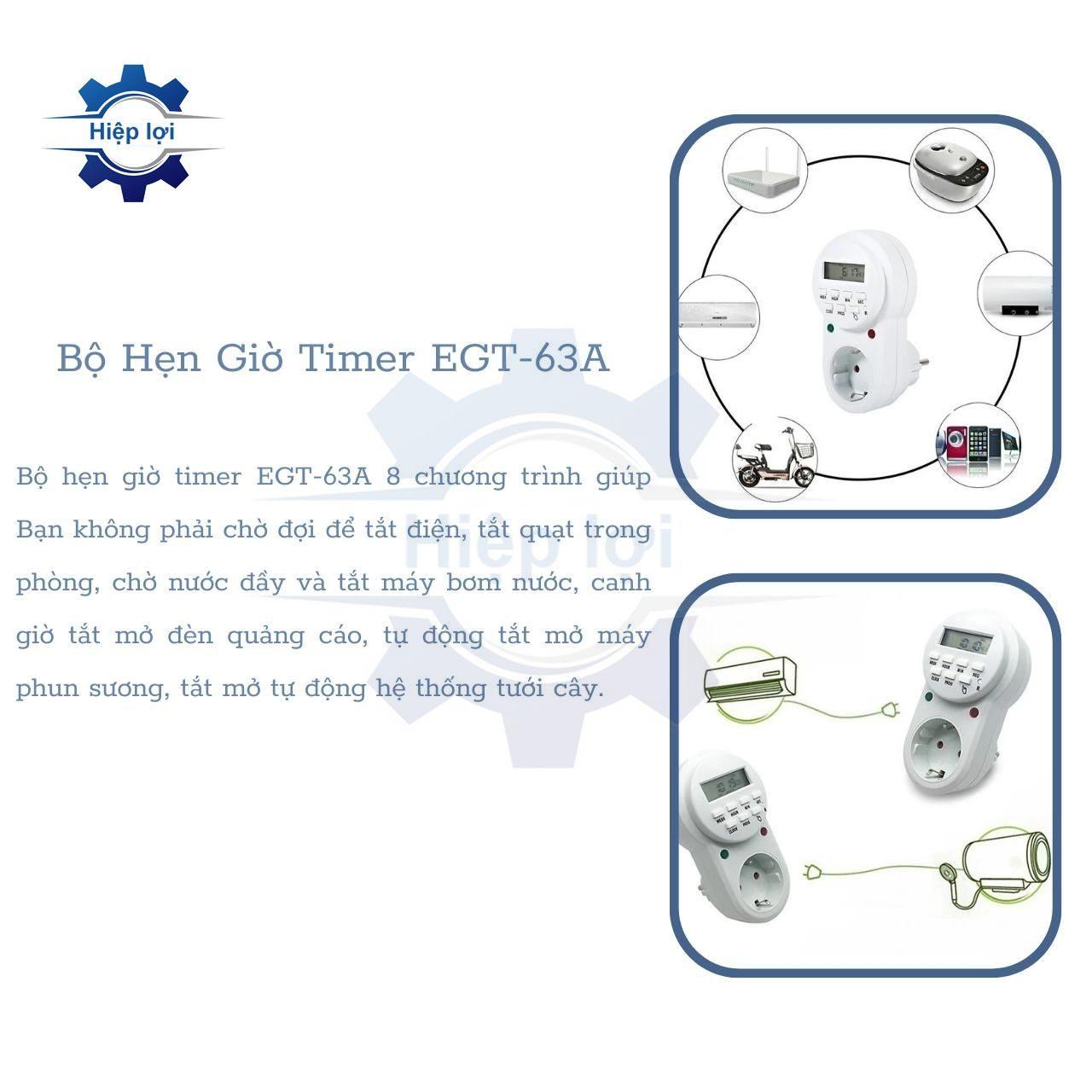 Bộ hẹn giờ timer như TG-16A Cơ 15 phút và EGT-63A Điện 8 điểm có nhiều chức năng và lợi ích quan trọng trong việc quản lý thời gian và kiểm soát hoạt động của các thiết bị. Dưới đây là một số chức năng chính và lợi ích của bộ hẹn giờ: