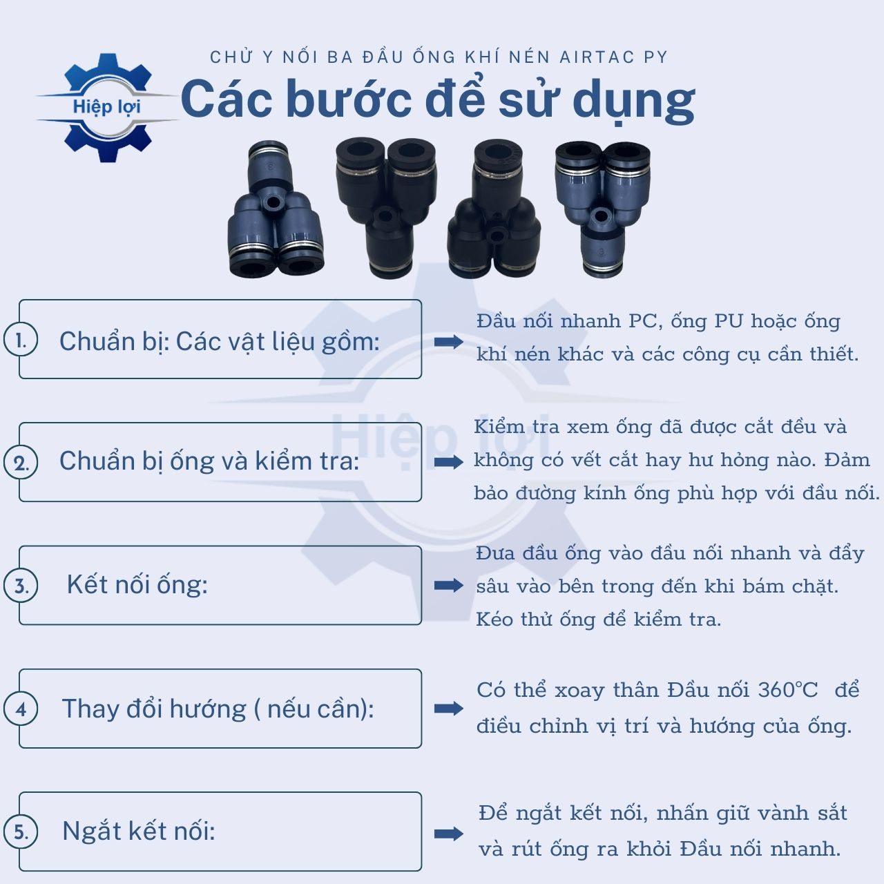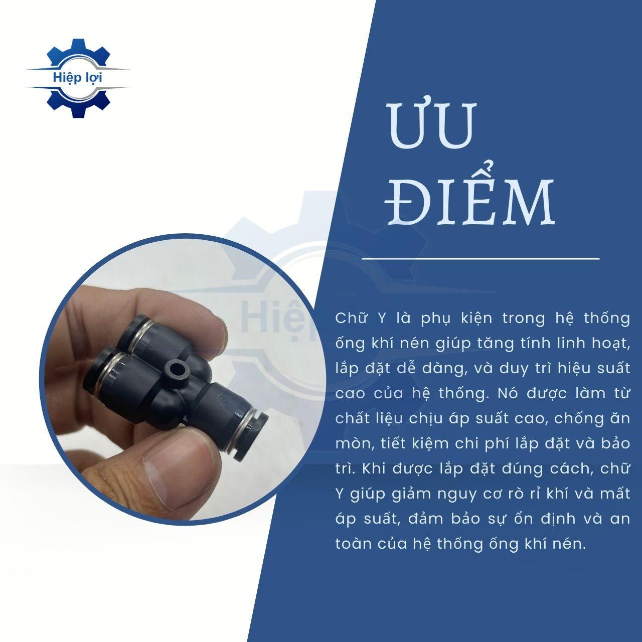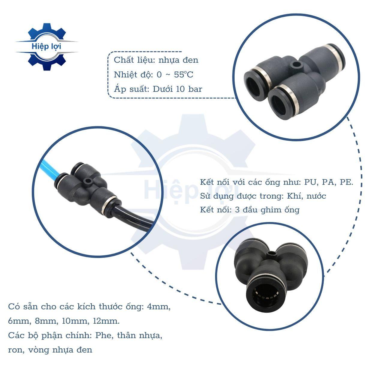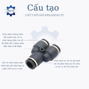 - Chử Y được thiết kế để kết nối ba ống khí nén, tạo ra một chiều đáp ứng đa hướng. Nó cho phép luồng khí nén chuyển đổi giữa các đường ống một cách linh hoạt.