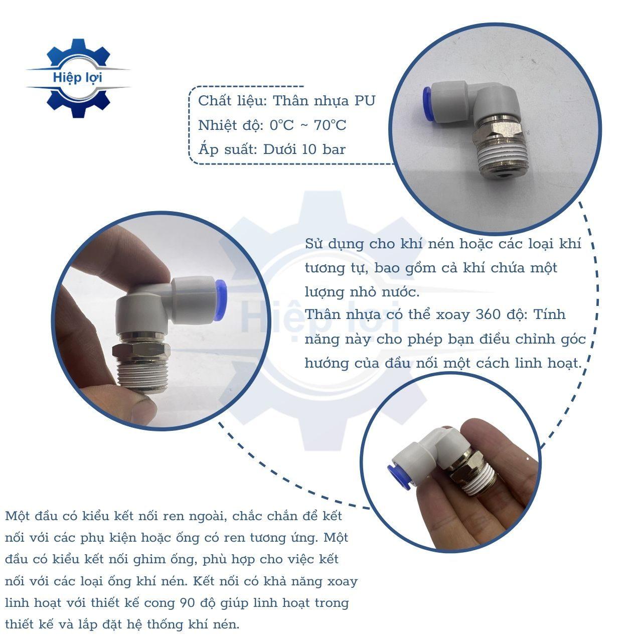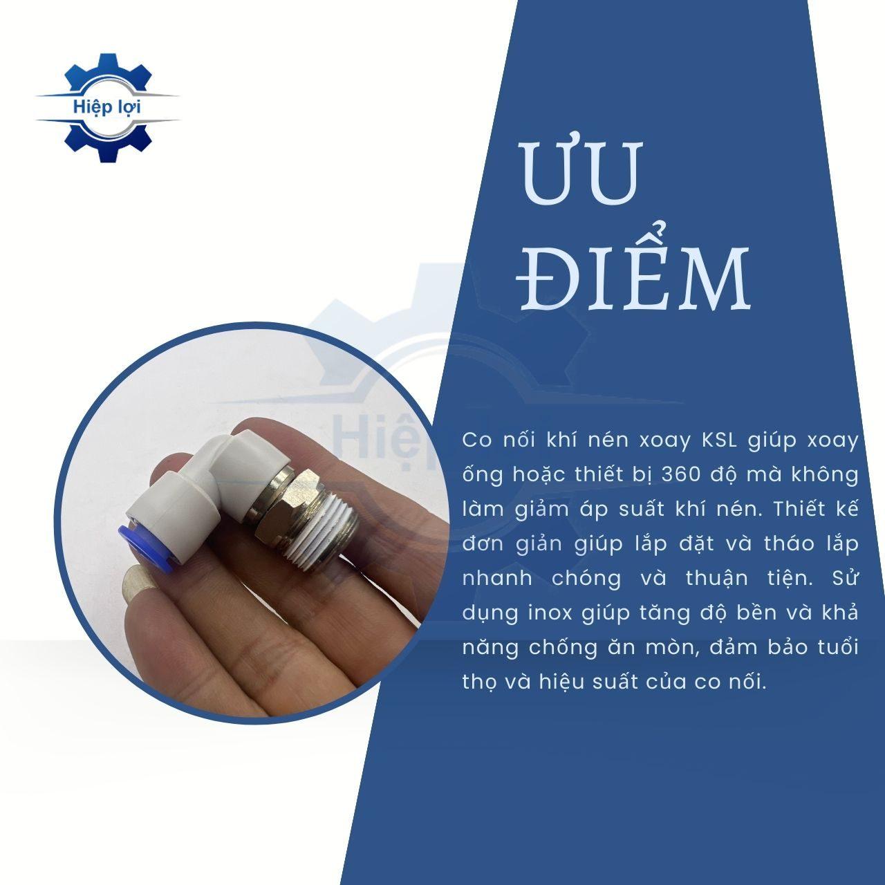- Tính Linh Hoạt: Co nối khí nén xoay KSL thường mang lại tính linh hoạt trong việc lắp đặt ống khí nén, đặc biệt là trong các không gian hạn chế hoặc khi cần điều chỉnh hướng dòng khí.