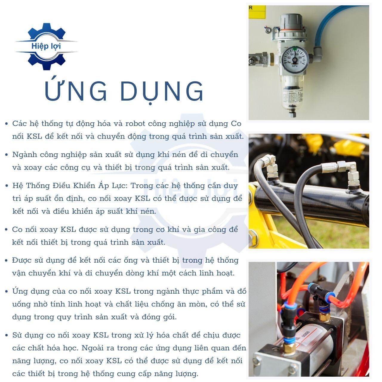 - Co nối khí nén xoay KSL cũng có thể được sử dụng trong các máy móc và thiết bị tự động hóa để giúp cải thiện tính linh hoạt của hệ thống.