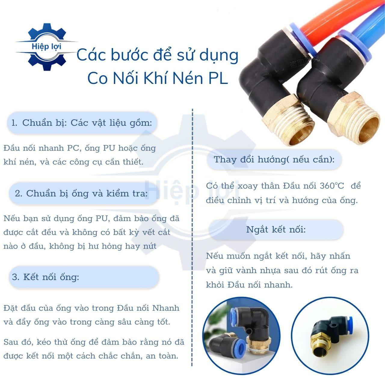 - Chức năng chính của co nối 90 độ PL là kết nối ống khí nén với ren ngoài một cách đơn giản và linh hoạt.