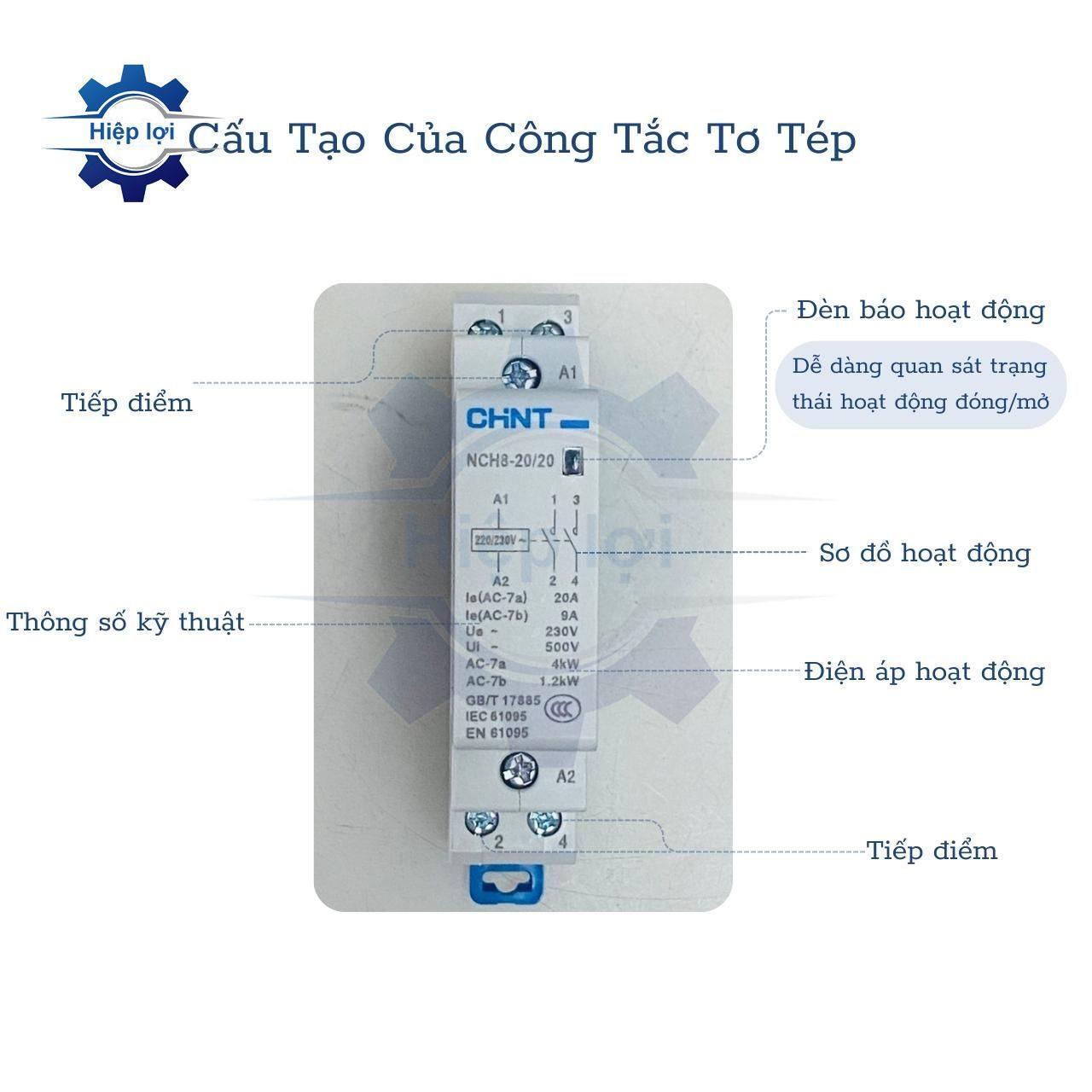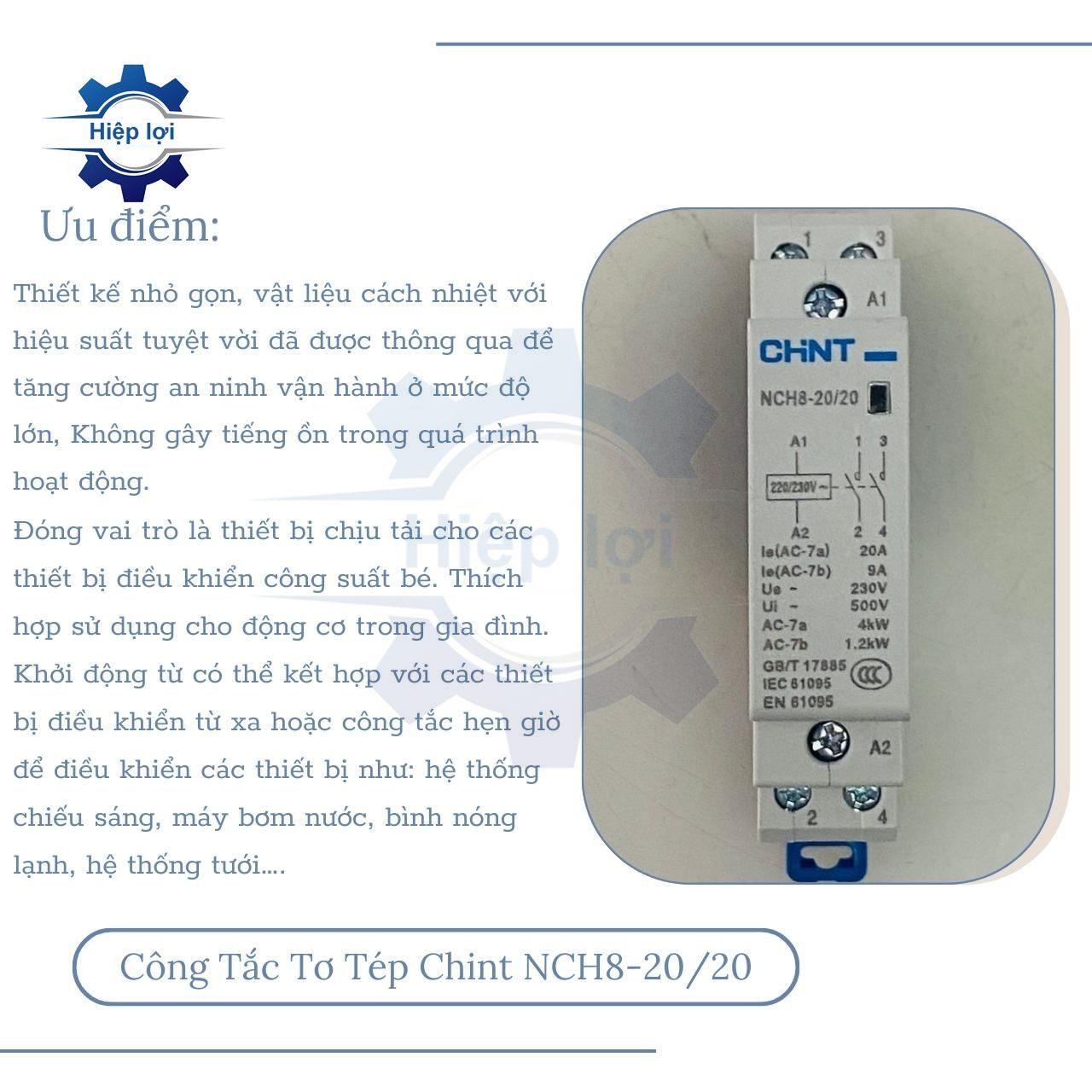 Công tắc tơ tép Chint NCH8-20/20 là một sản phẩm trong lĩnh vực điện và điều khiển, được sản xuất và cung cấp bởi Tập đoàn Chint Group, một công ty hàng đầu trong ngành điện công nghiệp của Trung Quốc. Công tắc tơ tép (hay còn gọi là công tắc tụ bù) là một thành phần quan trọng trong hệ thống điện, thường được sử dụng để điều chỉnh và kiểm soát điện áp và dòng điện.