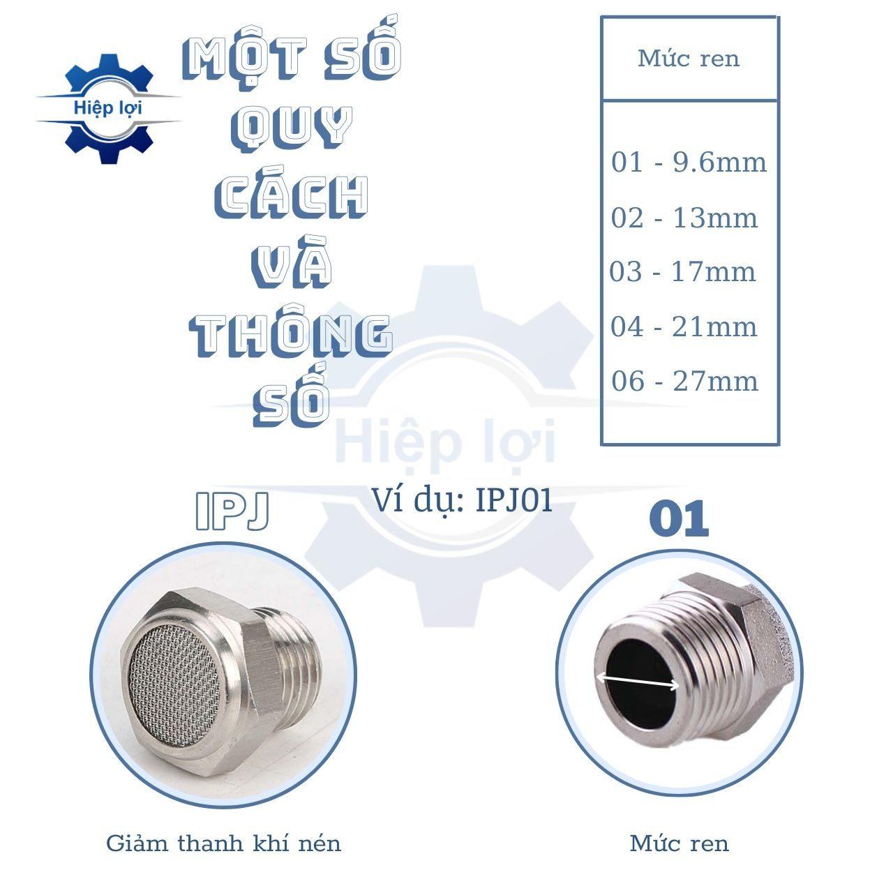- Giảm Thanh Khí Nén Bằng Inox IPJ được thiết kế để giảm tiếng ồn tạo ra trong quá trình xã khí nén, cung cấp môi trường làm việc yên tĩnh hơn và giảm ảnh hưởng đến sức khỏe của nhân viên.