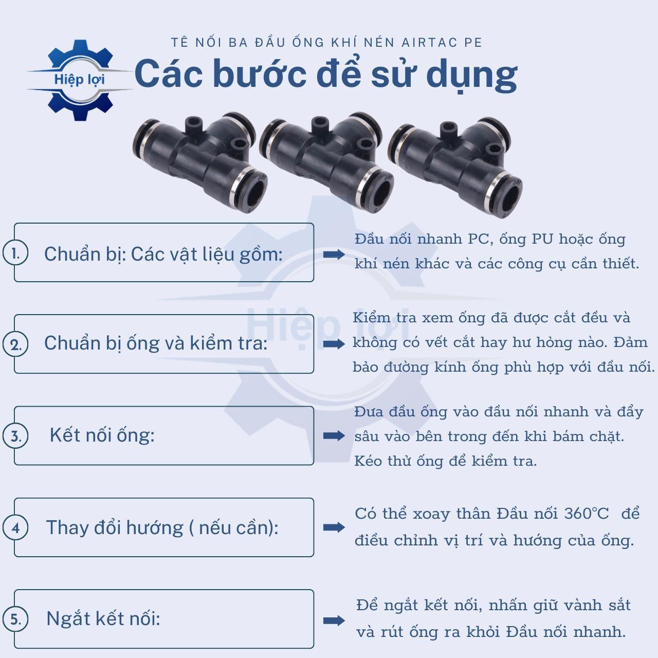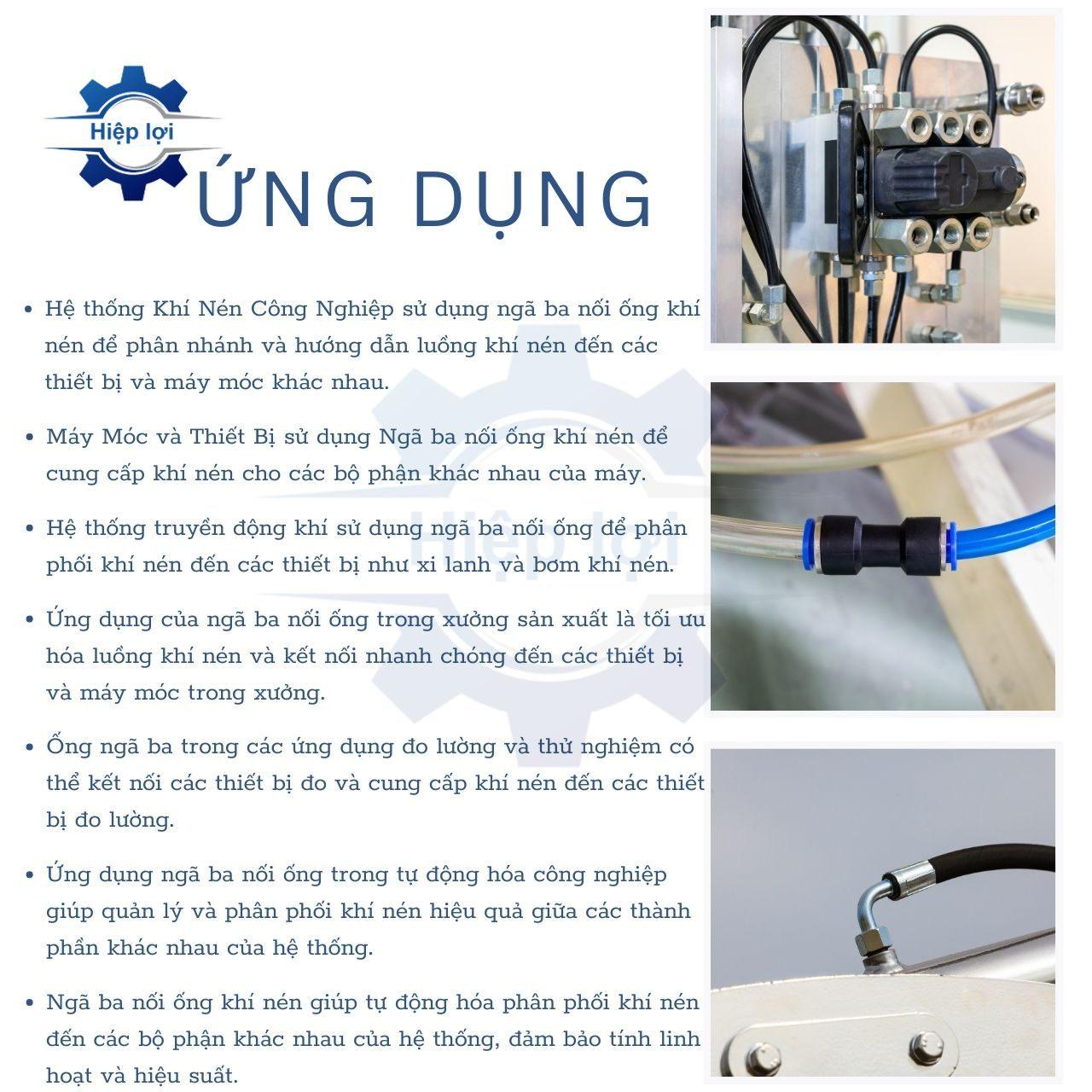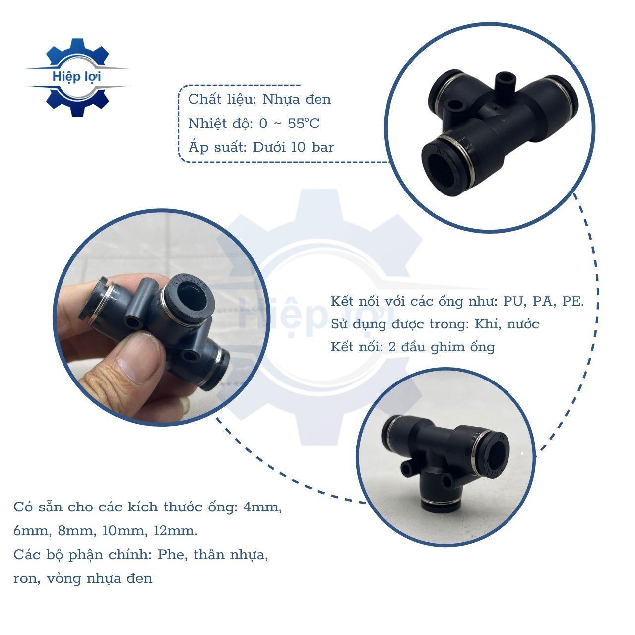 - Cho phép kết nối linh hoạt các ống khí nén, tạo ra một hệ thống có cấu trúc chữ “T” các đoạn ống.