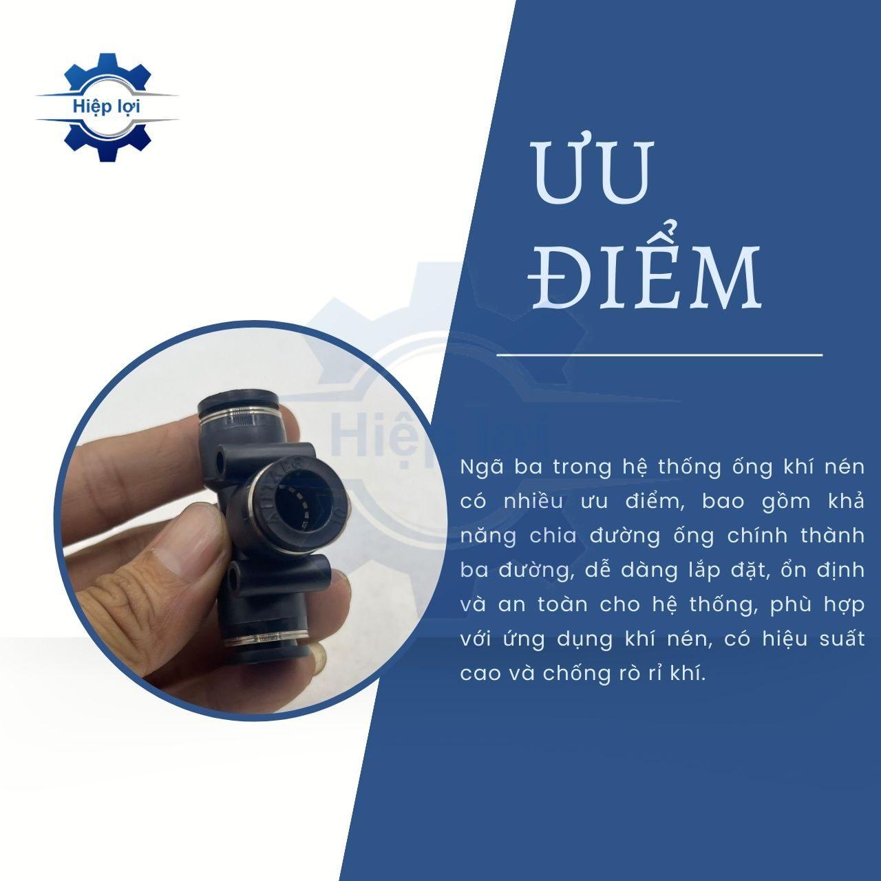 - Ngã ba được thiết kế để phân phối chất khí nén từ một nguồn đến ba đường ống khí nén, giúp điều phối chất khí nén trong hệ thống.