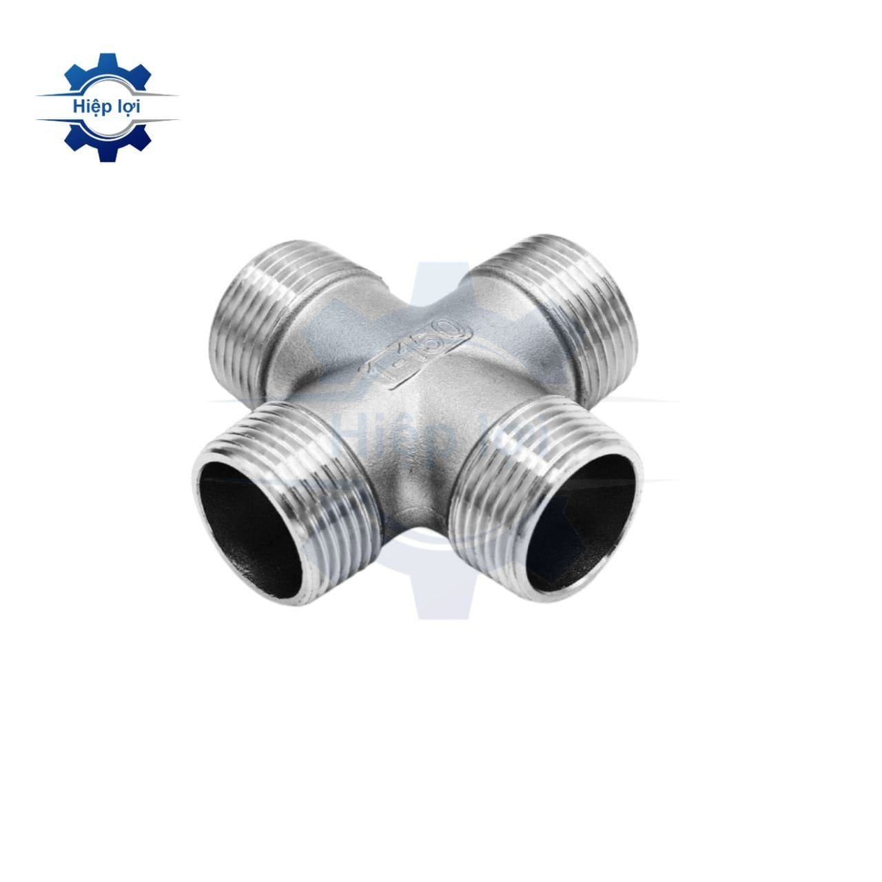 Nối ngã tư chữ thập inox có thiết kế chữ thập, với các ren ở mỗi đầu của các cánh chữ thập. Các ren này được thiết kế để phù hợp với tiêu chuẩn ren thông thường, cho phép việc kết nối chặt chẽ và an toàn với các thành phần khác trong hệ thống.
