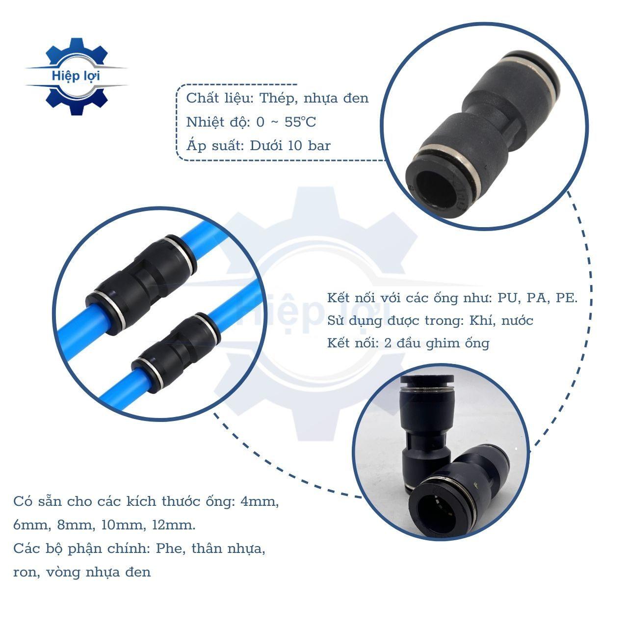 - Chức năng chính là kết nối hai đoạn ống khí nén Polyurethane với nhau trong hệ thống khí nén.