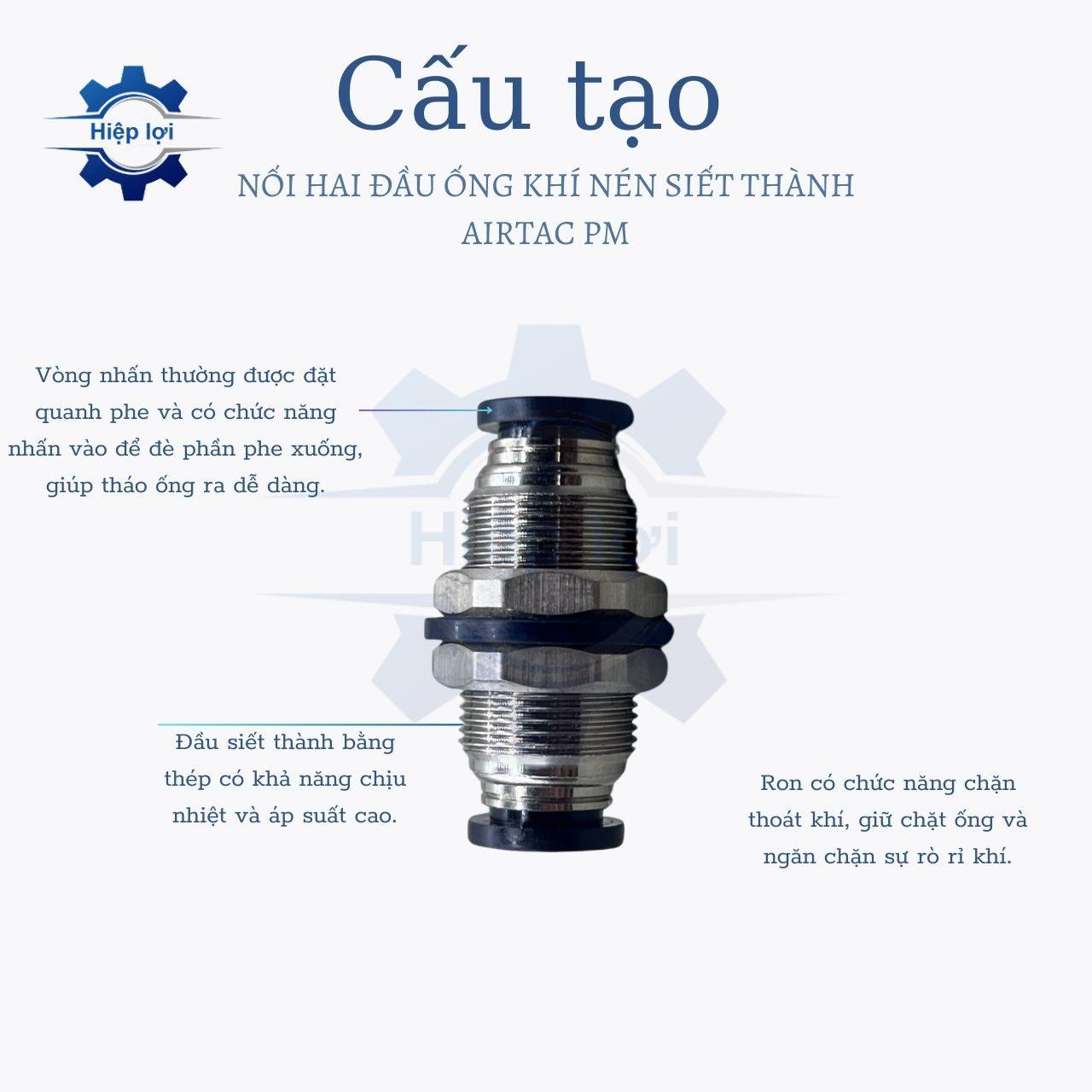 - Nối hai đầu ống khí nén siết thành AIRTAC PM có thiết kế siết thành ở cả hai đầu, giúp tạo ra một kết nối chặt chẽ khi ống được đưa vào và siết chặt.