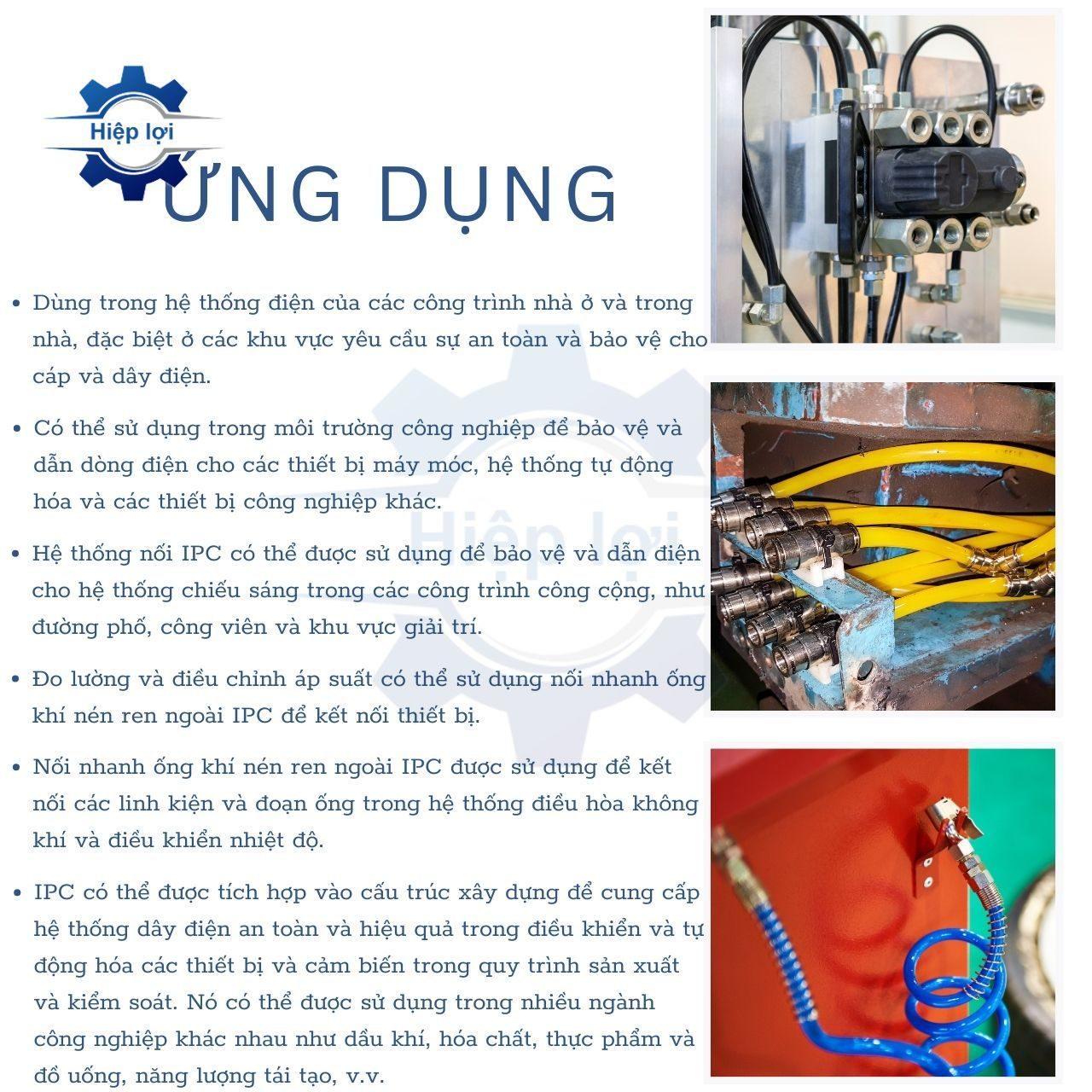 Ứng dụng: Nối ống khí nén Inox IPC thường được sử dụng trong các hệ thống ống khí nén, hệ thống dẫn khí, và các ứng dụng khác liên quan đến dòng khí áp lực. Dưới đây là một số ứng dụng phổ biến: