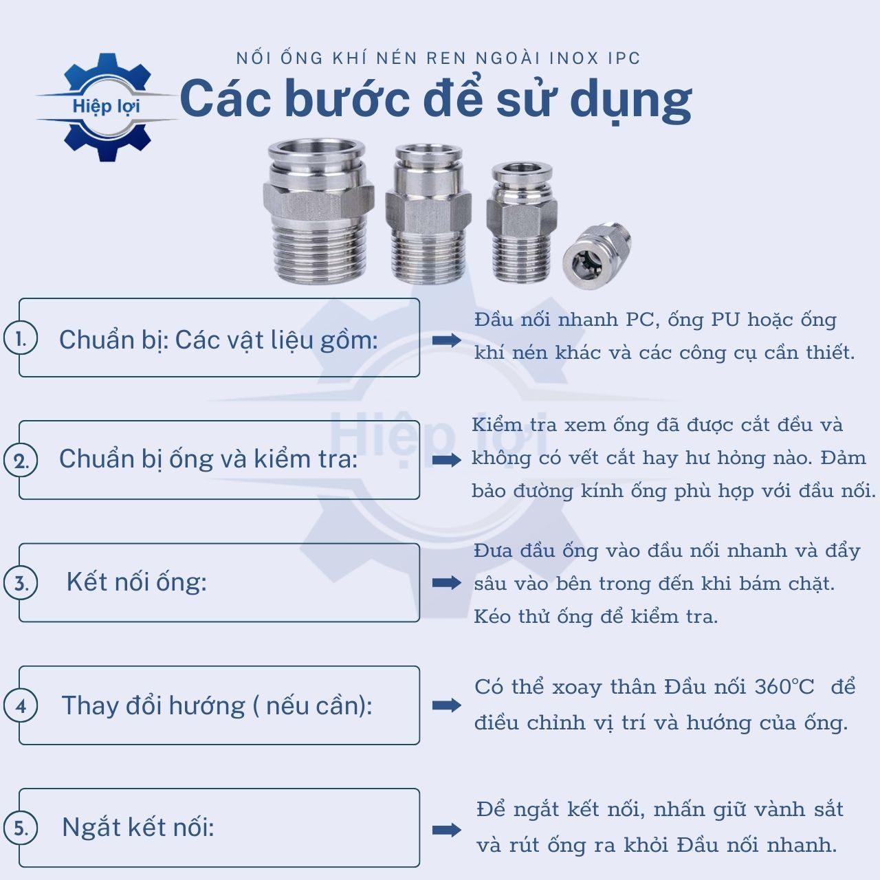 - Không Sử Dụng Cho Chất Khác Quy Định: Sử dụng nối ống khí nén inox IPC cho các loại chất được quy định, và tránh sử dụng cho chất có thể gây ăn mòn hoặc hủy hoại sản phẩm.
