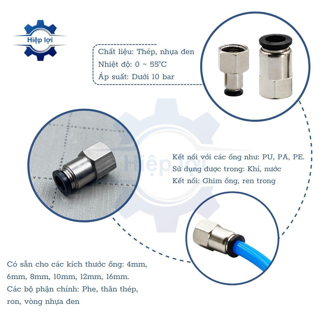 - Kết nối Nhanh Chóng: Phụ kiện nối nhanh ống khí nén ren trong giúp thực hiện việc kết nối và ngắt kết nối giữa các ống một cách nhanh chóng, tiết kiệm thời gian và công sức trong quá trình bảo trì và lắp đặt.