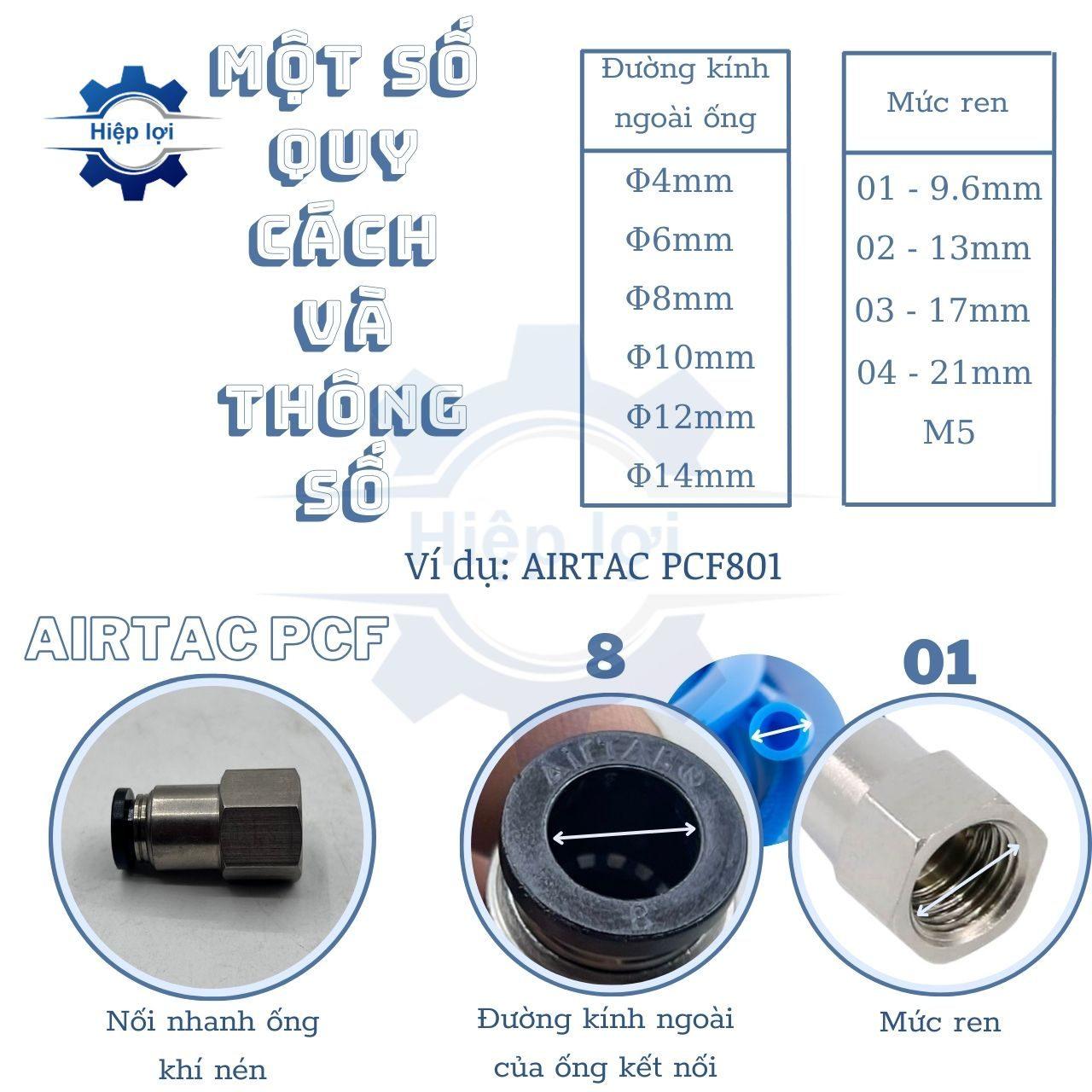 - Nối nhanh AIRTAC PCF cung cấp khả năng kết nối linh hoạt giữa các đoạn ống khí nén có đường kính ren trong và các loại ống khí nén như PU, PA, PE.