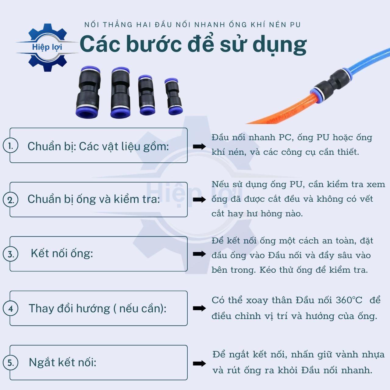 - Chọn đúng kích thước ống: Đảm bảo rằng bạn chọn sản phẩm có kích thước phù hợp với ống khí nén PU mà bạn đang sử dụng. Kích thước phải tương ứng để đảm bảo sự kín đáo và hiệu suất tốt.