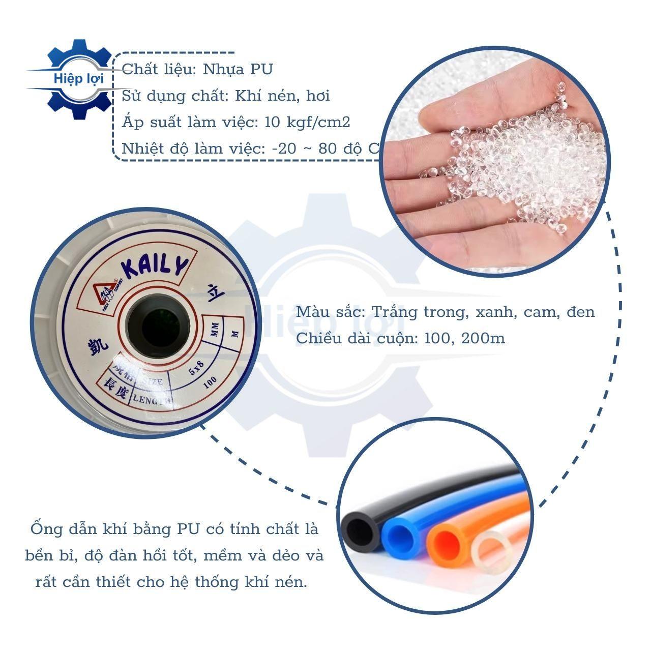 - Đường kính và độ dày: Ống hơi khí nén PU KAILY có nhiều kích thước với đường kính và độ dày khác nhau, tùy thuộc vào nhu cầu sử dụng và áp suất làm việc cần thiết.