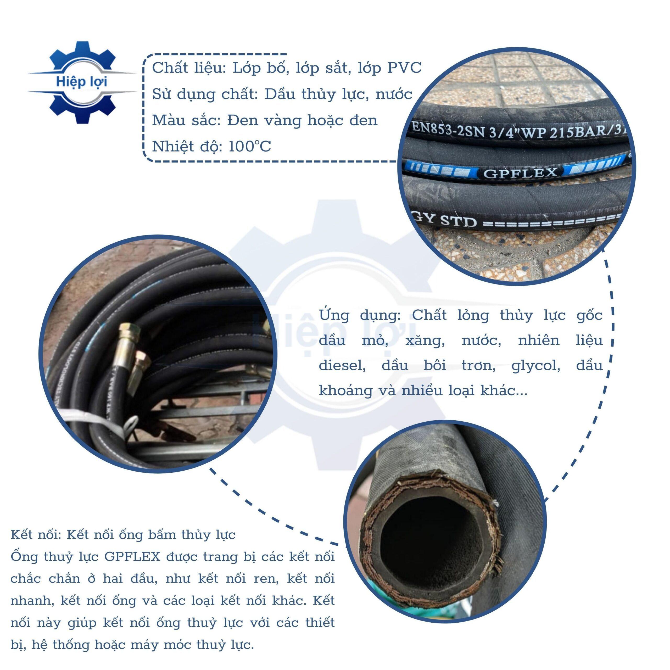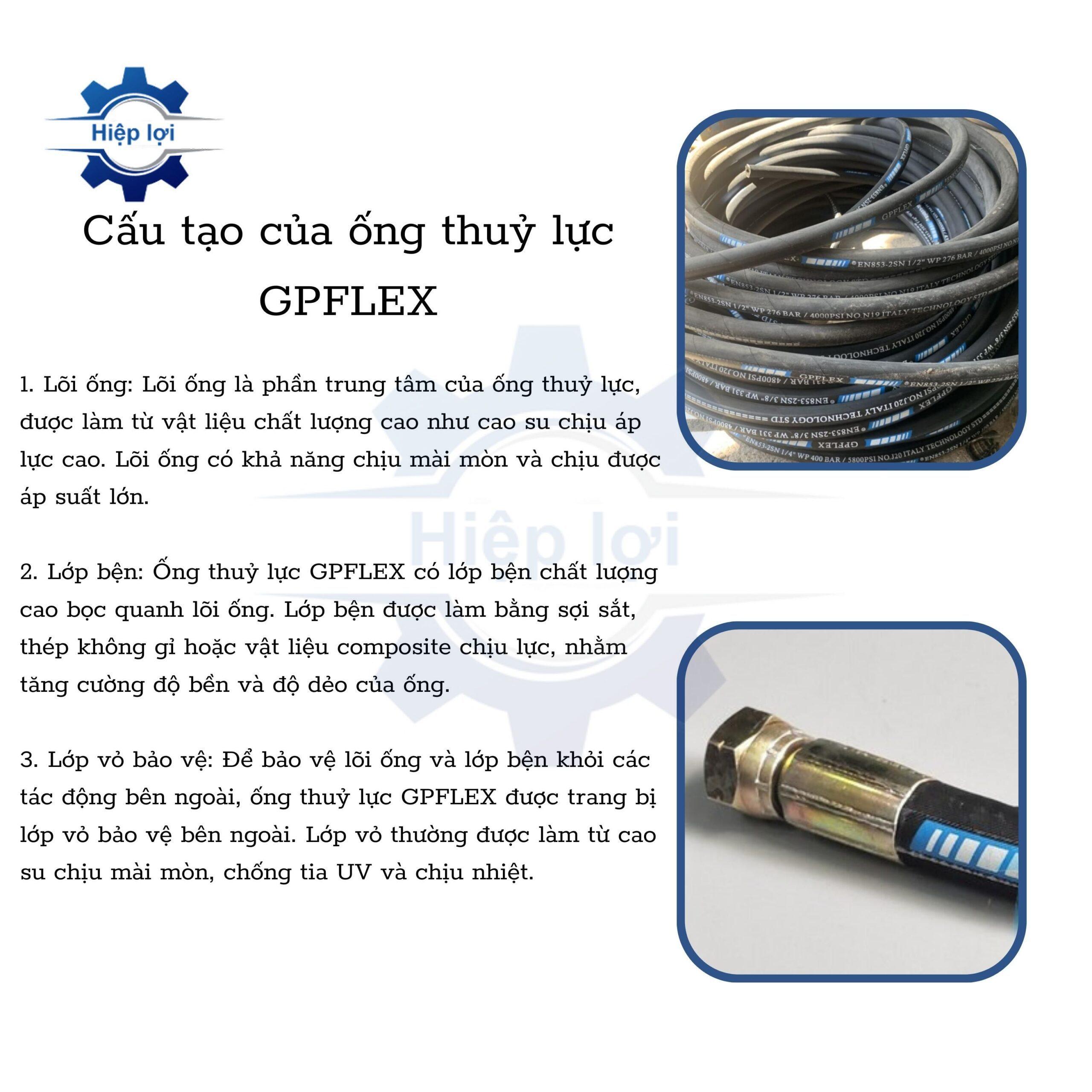 Các ống Thuỷ Lực GPFLEX thường được làm từ cao su chịu nhiệt, có lớp lõi bện bằng thép không gỉ hoặc thép cacbon cường độ cao để tăng khả năng chịu áp lực và đảm bảo tính linh hoạt. Bề mặt của ống thường được bọc lớp cao su chịu mài mòn để bảo vệ và gia tăng tuổi thọ của ống.